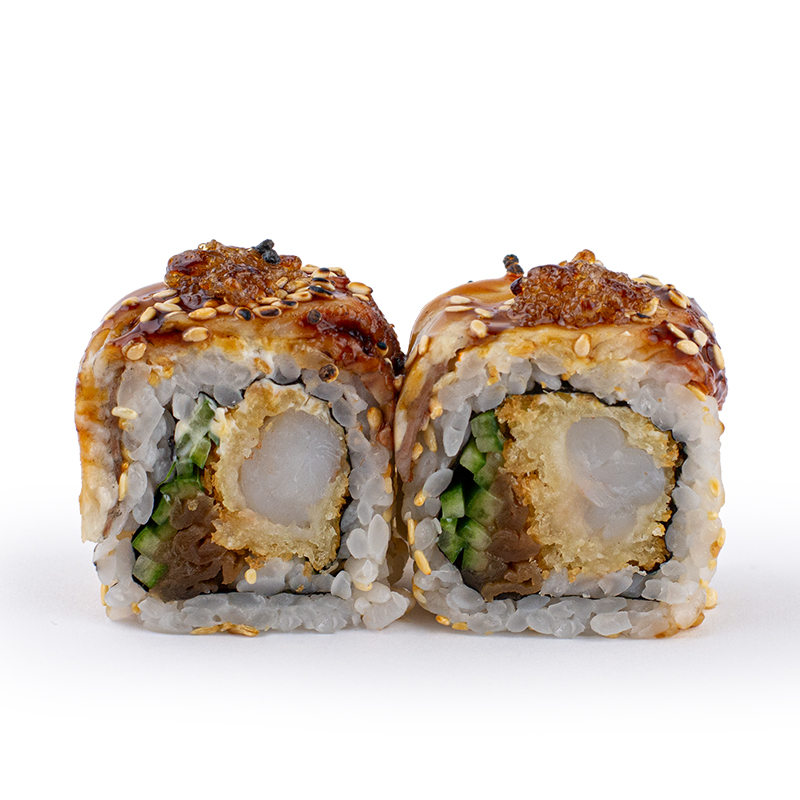 Tigrinės krevetė, tomago omletas, tepamasis sūris, Masago ikrai, pikantiškas majonezas