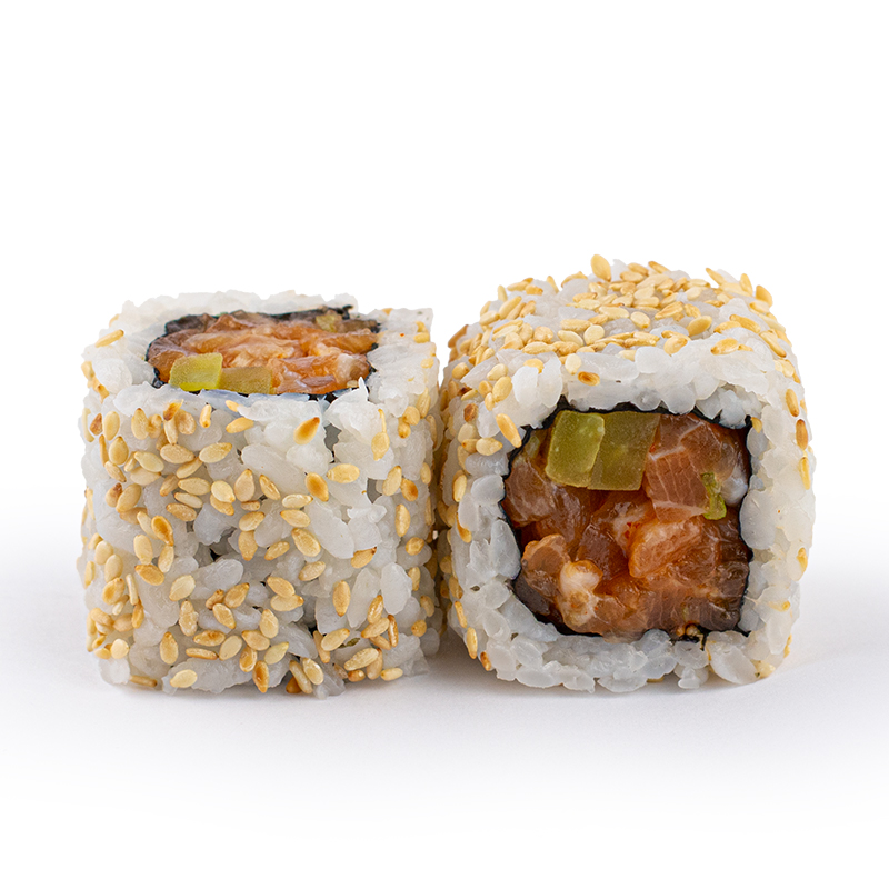 Lašišos, avokadai, agurkai, Yuzu sultys, aitriųjų paprikų-apelsinų džemas, kalendros, sezamų sėklos