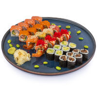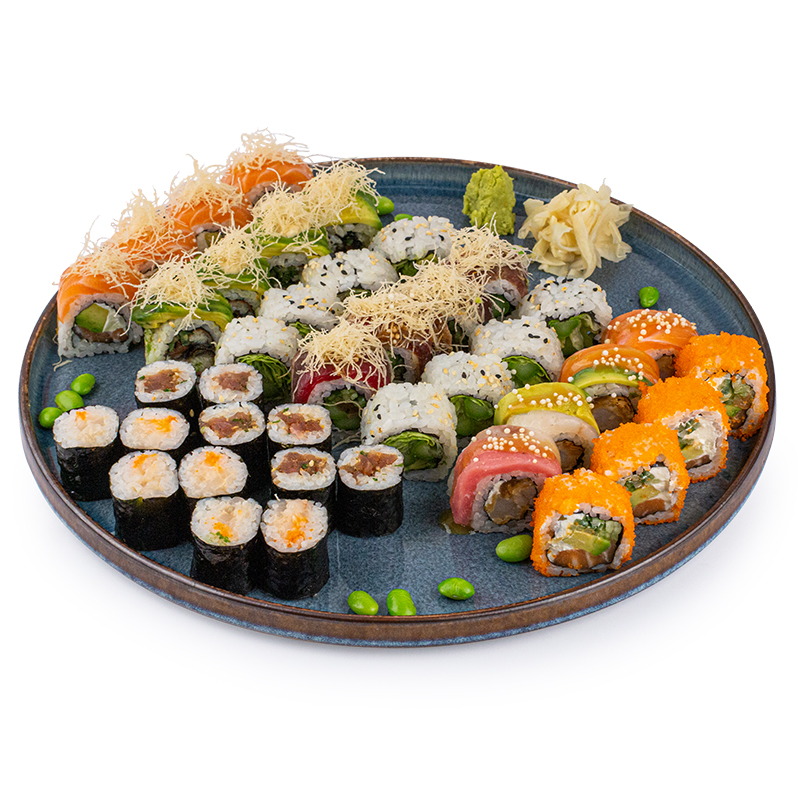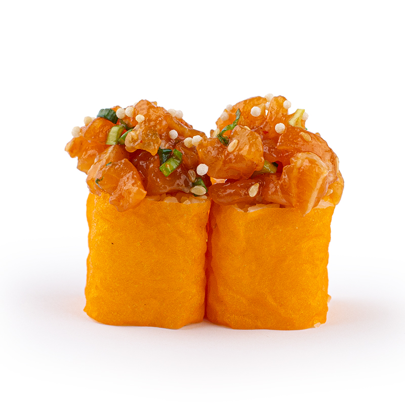 Salmon, avocado, cucumber, shiitake, grated cheese, piquant sauce, Tobiko roe