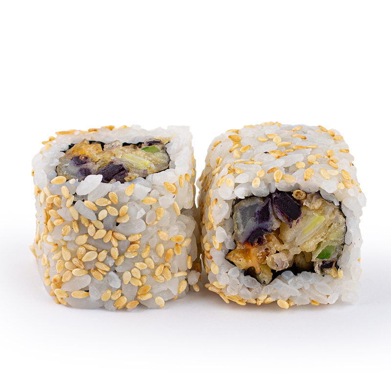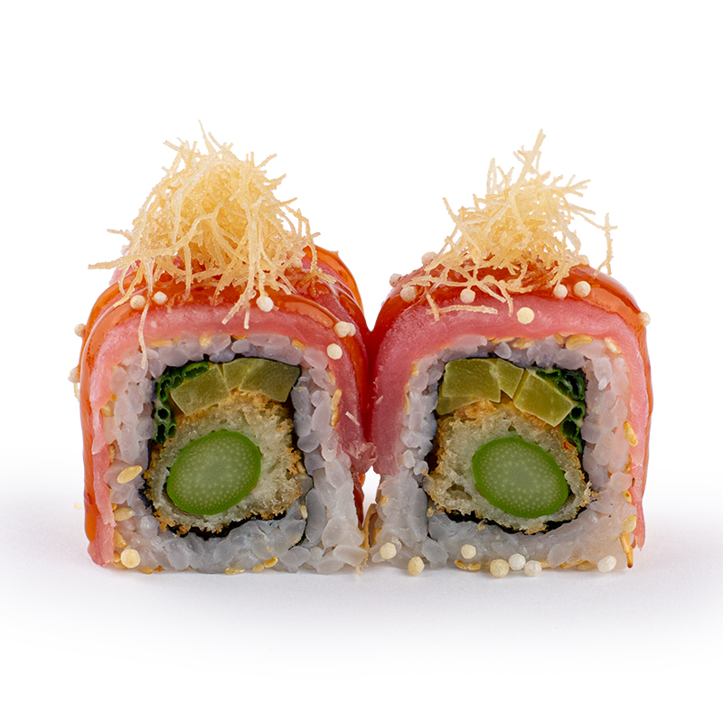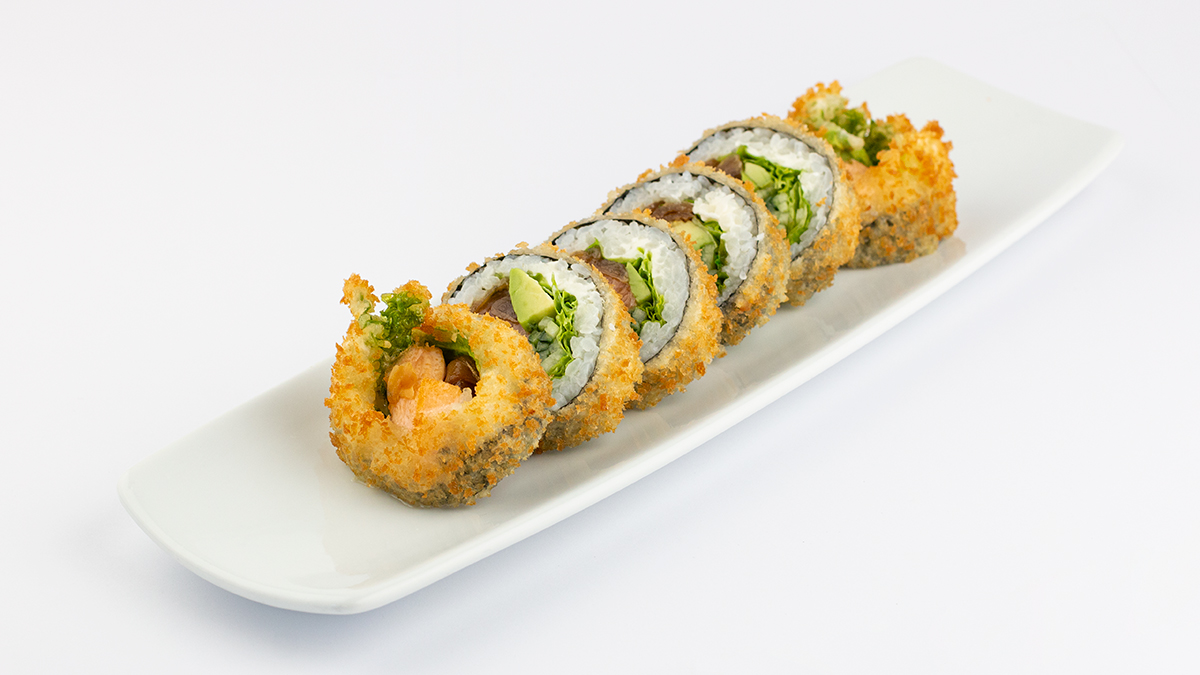 Salmon tempura, cucumber, avocado, kanpyo pumpkin, lettuce, chives, piquant sauce, sesame seeds