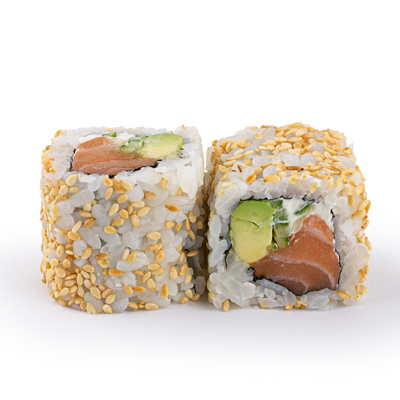 Salmon, cream cheese, avocado, cucumber, sesame seeds