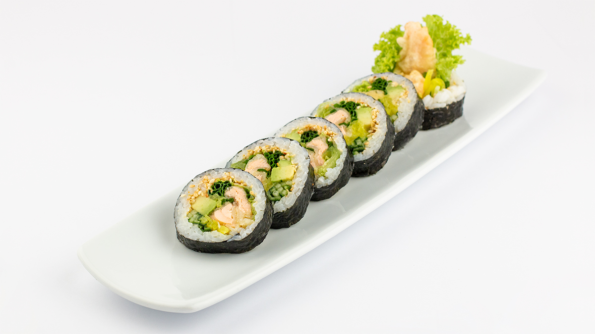 Salmon, cucumber, kanpyo pumpkin, avocado, lettuce, cream cheese
